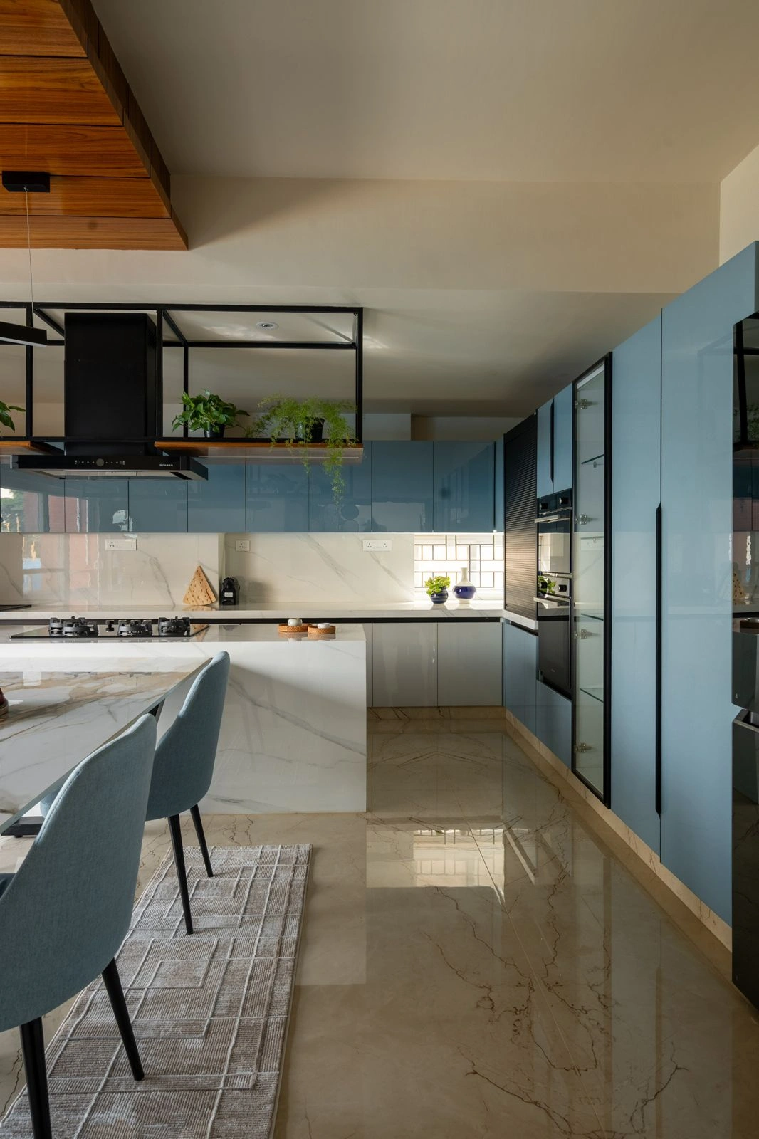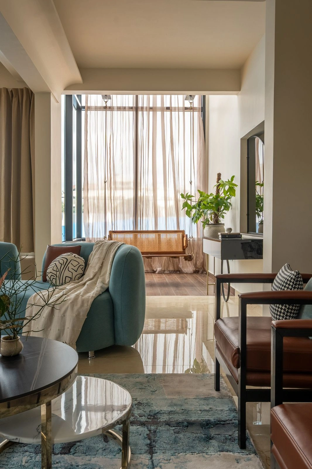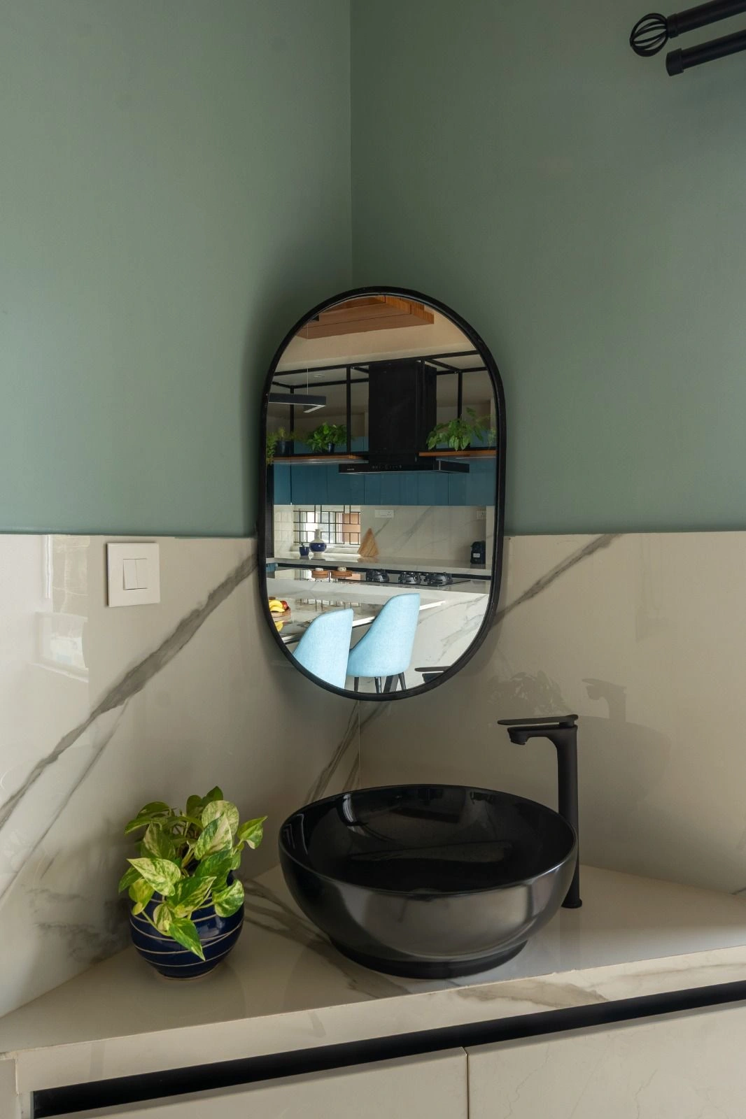 Laguna shades, reflective green-blue hues, rattan cane accents, black metal elements, mirrors, and glass partitions introduce layers of texture and dimension.