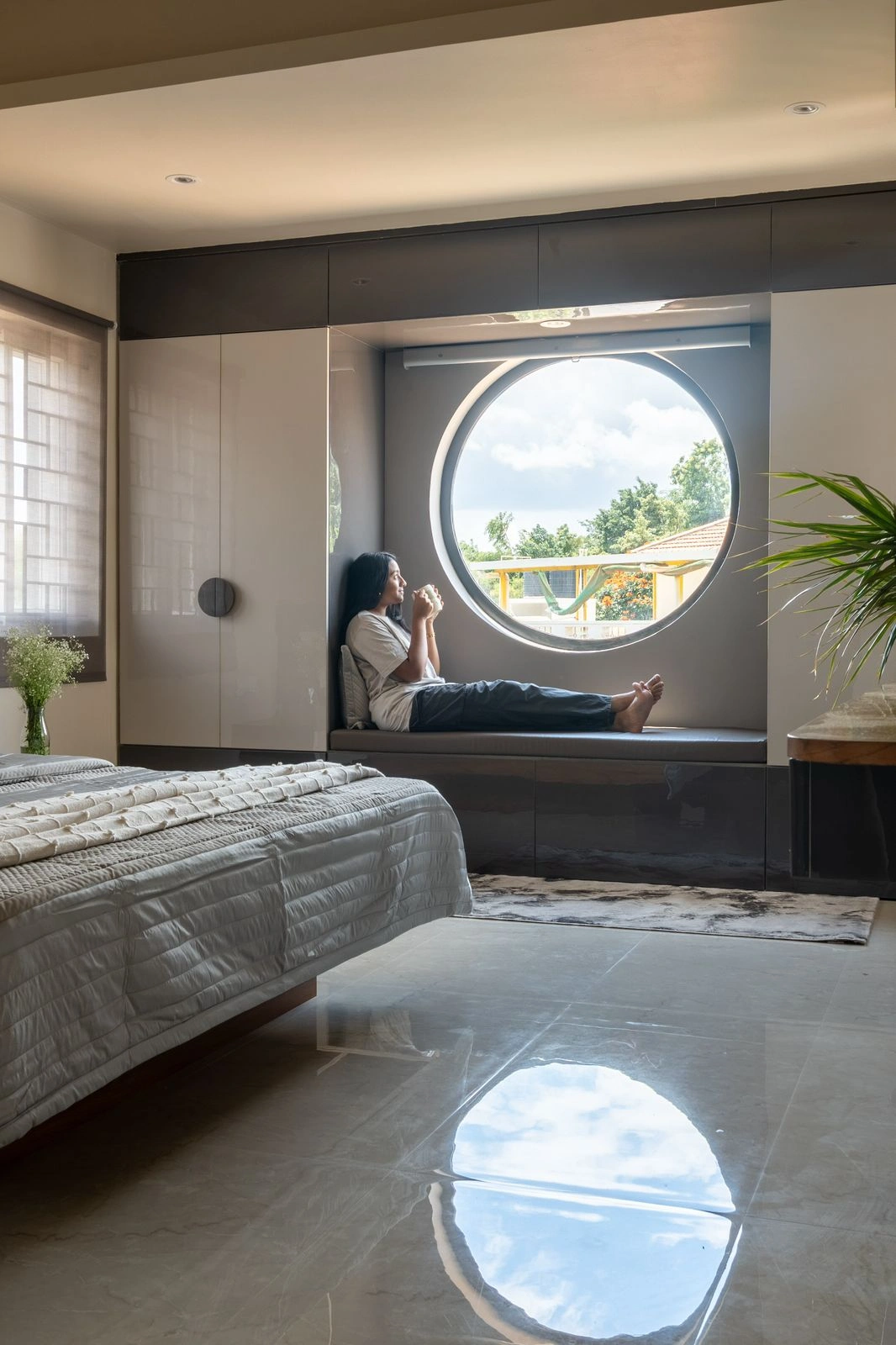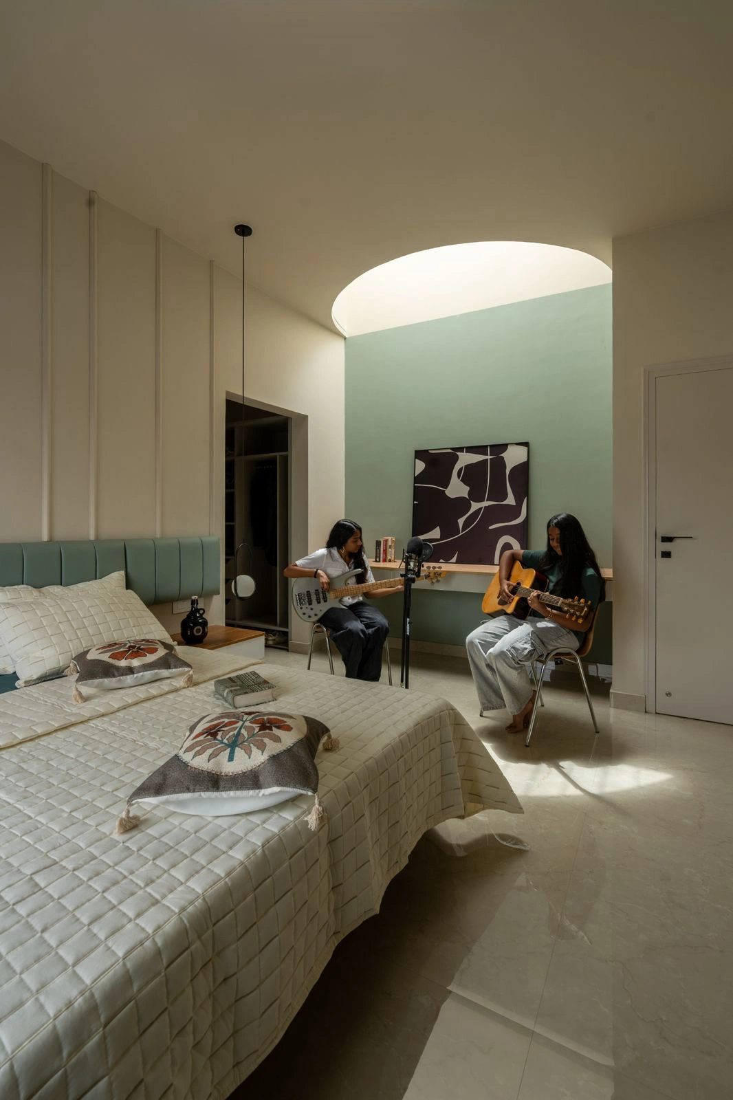A timeless palette of grey, white, and beige marble, enriched by dark walnut wood, enhances the atmosphere. Additional tones like tan, muted gold, and sage seamlessly integrate, forming an unified and harmonious design. Varied styles of illumination and meticulous décor infuse warmth and expression into every corner. The incorporation of bespoke furniture, fabric, and wall art collectively elevates the overall allure of Ashraya Residence.