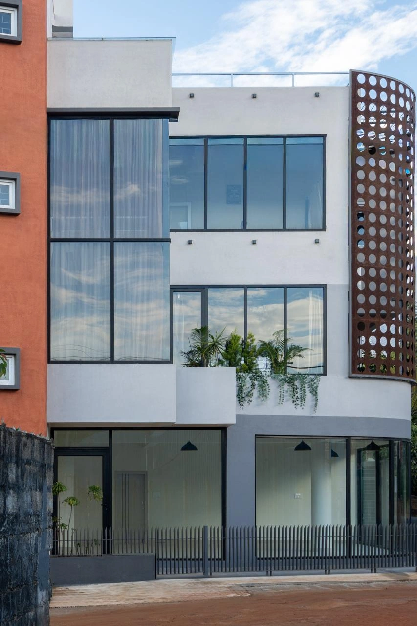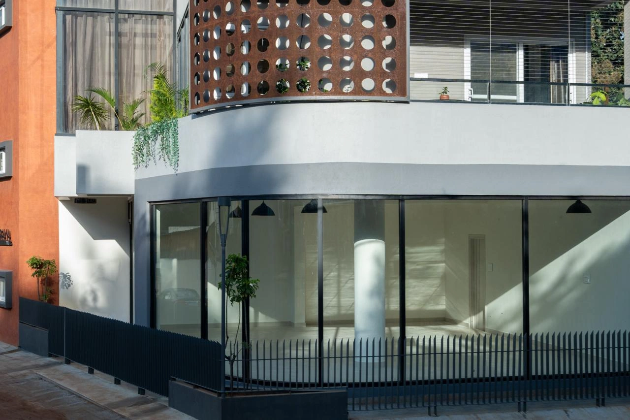 The first level blends business and tranquility, featuring dedicated commercial space and a thoughtfully designed 1 BHK unit, offering a serene retreat within the city. On the second level, an expansive living area bathed in natural light, an island kitchen, and a guest bedroom create an inviting ambiance with large windows.