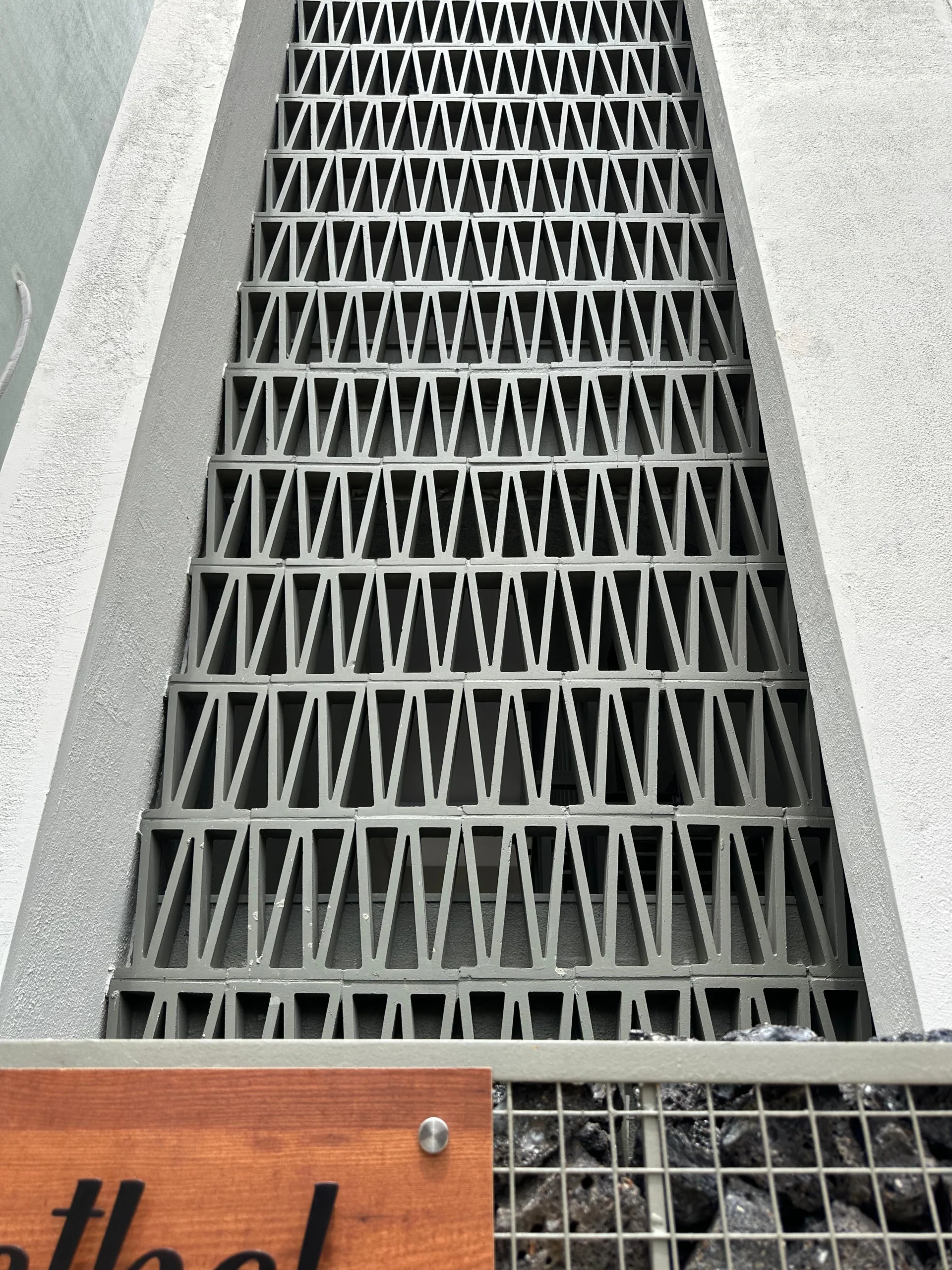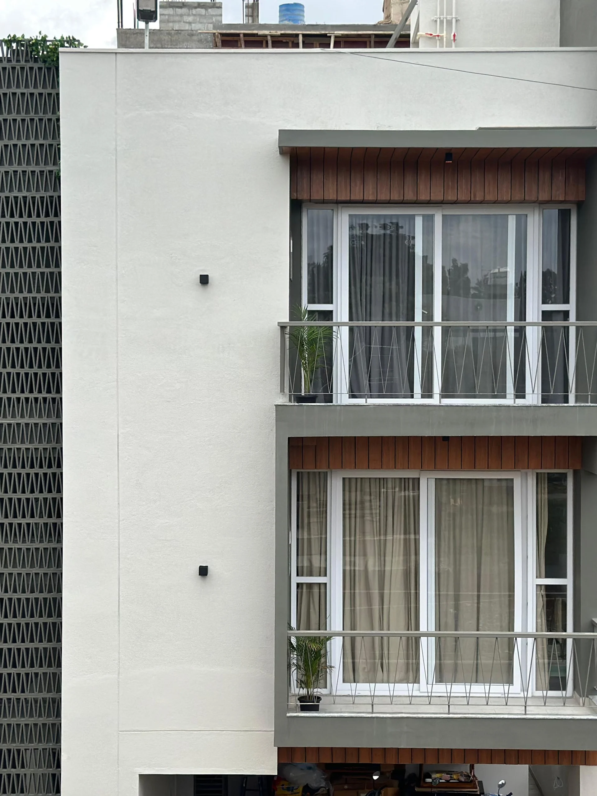 The architectural expression of the home is rooted in minimal grey tones accented with terracotta, creating a clean and timeless aesthetic. The entrance is marked by a 7 ft gabion wall with planter box, crafted from galvanized iron wire, and finished with a backlit nameplate for a contemporary touch. Rising behind it, the Eden Jaali staircase enclosure—a distinctive zig-zag patterned screen—acts as both a shading device and a striking visual feature. The same motif extends to the balcony railings, ensuring consistency. The two road-facing balconies are finished with terracotta-toned sara patta ceilings, tying the façade together with warmth and texture.
