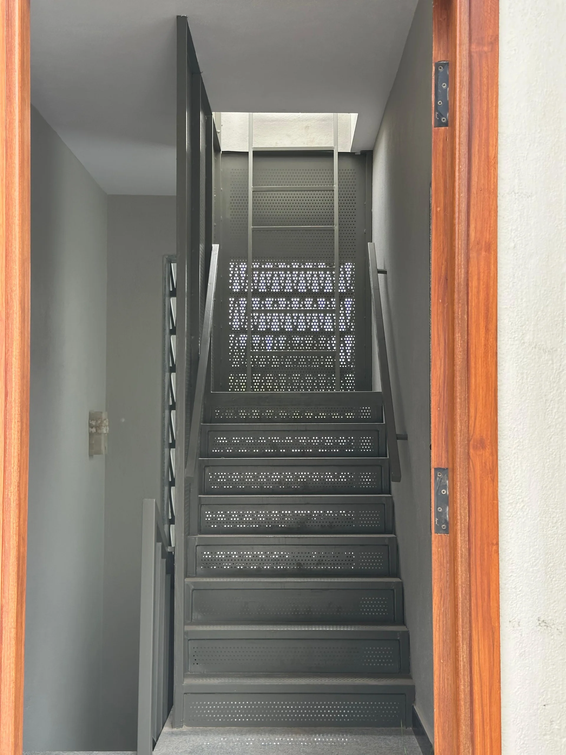 The residence integrates functional innovation with aesthetic clarity. A welded mild steel plate mesh staircase leads to the overhead tank (OHT), accessed through an outward-opening toughened glass hatch door and a complementary MS ladder.