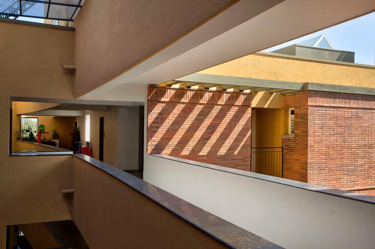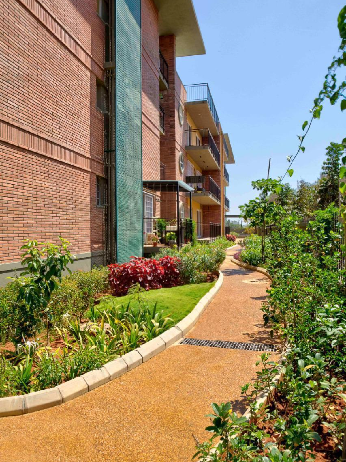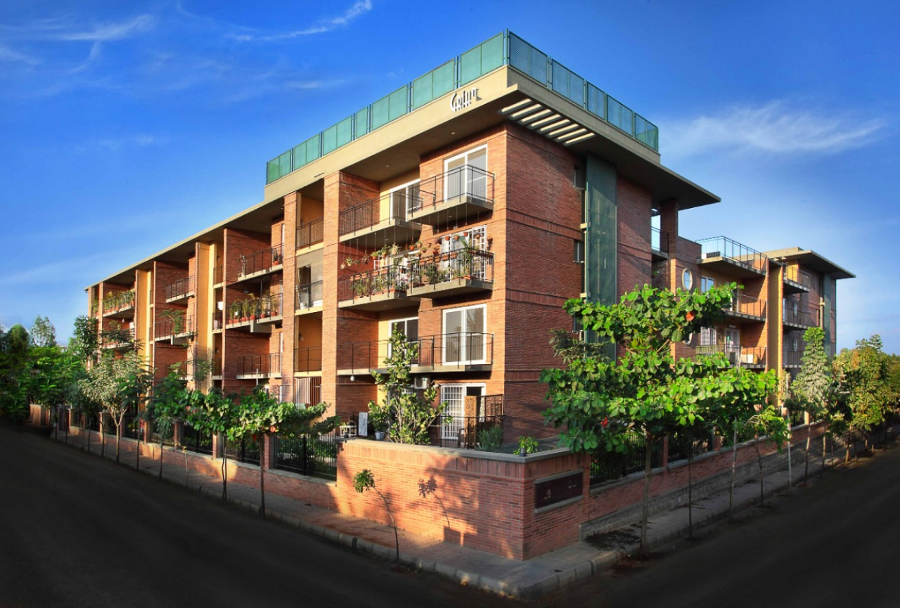 With a deep commitment to biophilic architecture, over 40% of the total land area is dedicated to open landscapes and thoughtfully designed dryscapes, seamlessly blending nature with the built environment. The complex exemplifies sustainability through the incorporation of rainwater harvesting systems, sewage treatment plants, and a centralized gas bank, showcasing Nebulous Design’s eco-friendly approach. In paying homage to the architectural vision of Le Corbusier, the Principal Architect has harmoniously combined exposed brickwork with painted facades, creating a visually striking aesthetic.