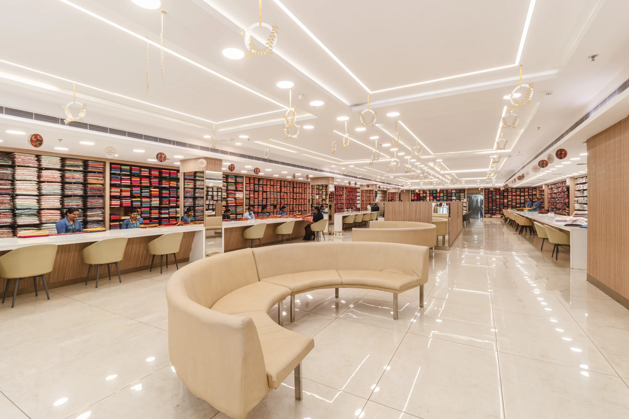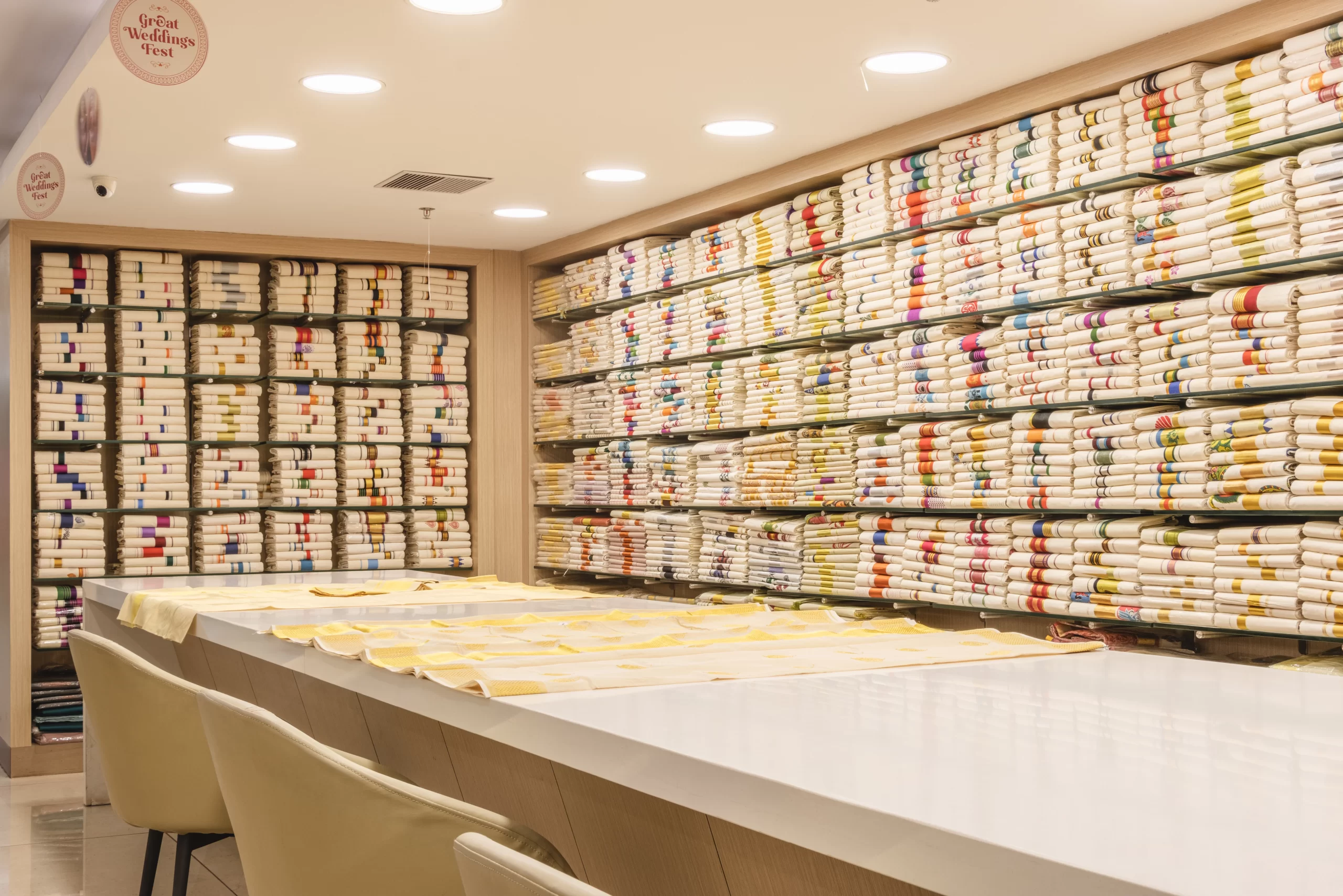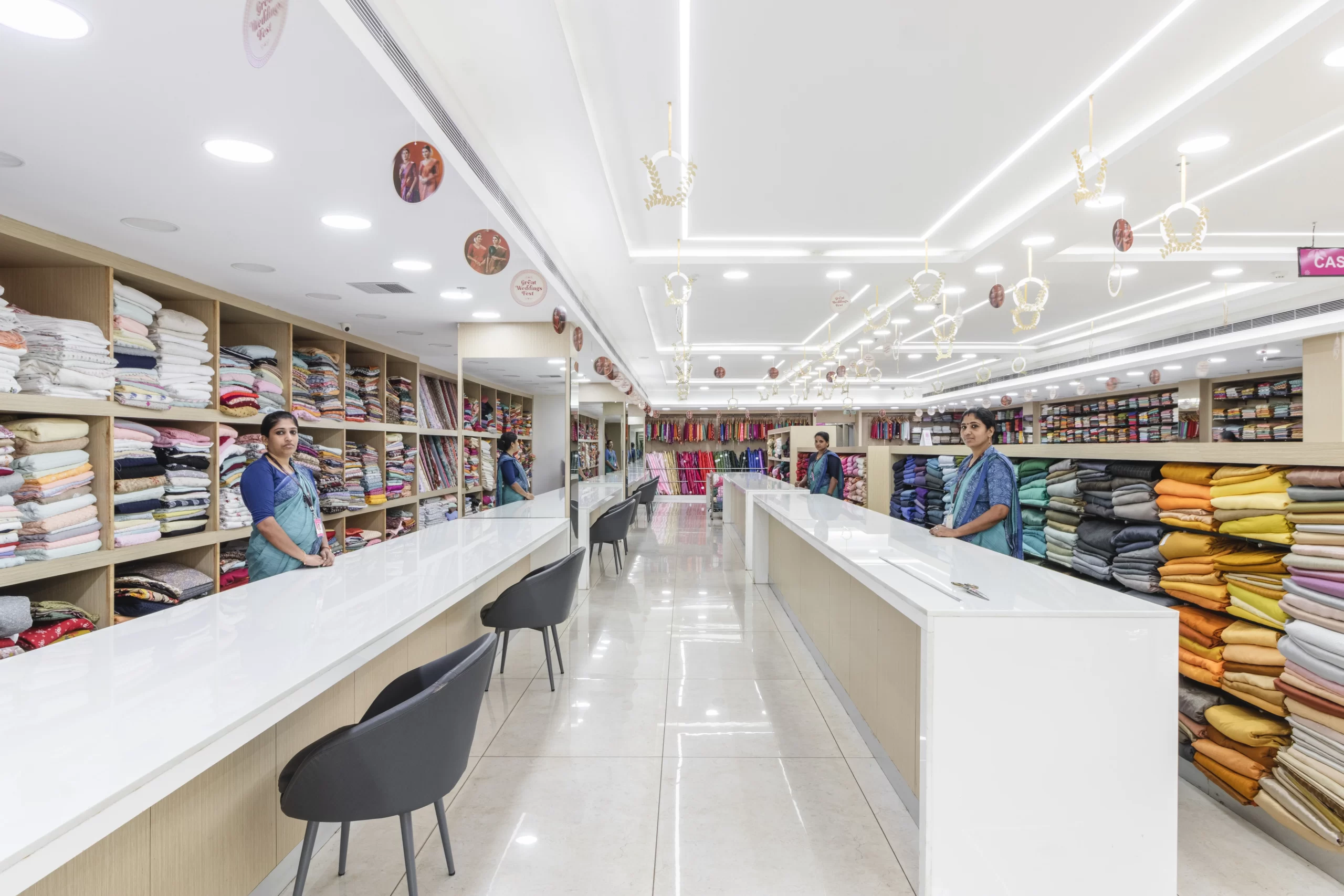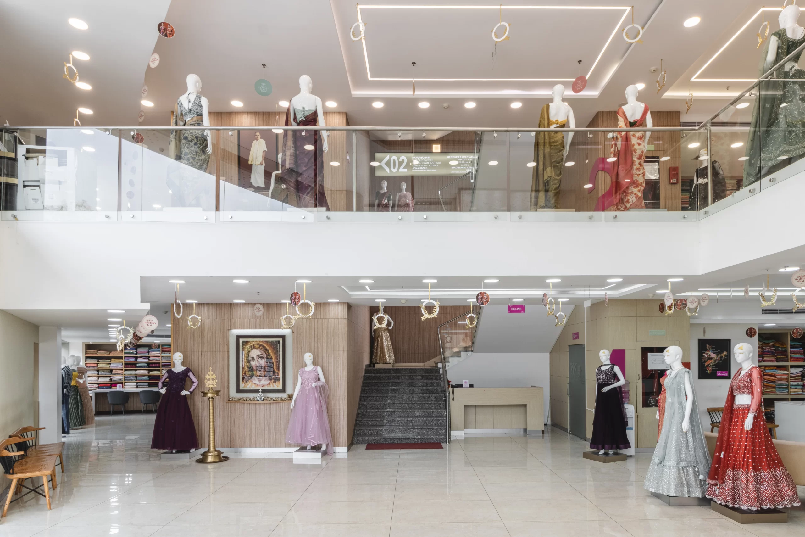 The showrooms were thoughtfully divided into different sections, each housing a diverse range of exclusive products. From fabrics and finished goods to casual saris, a dedicated bridal floor, ladies’ western wear, a kid’s section, and even a play area, every aspect was carefully considered. Each level of the showrooms seamlessly integrated various design elements, lighting, and spatial arrangement to create a harmonious symphony that beautifully presented Pulimoottil Silks’ exquisite collection.