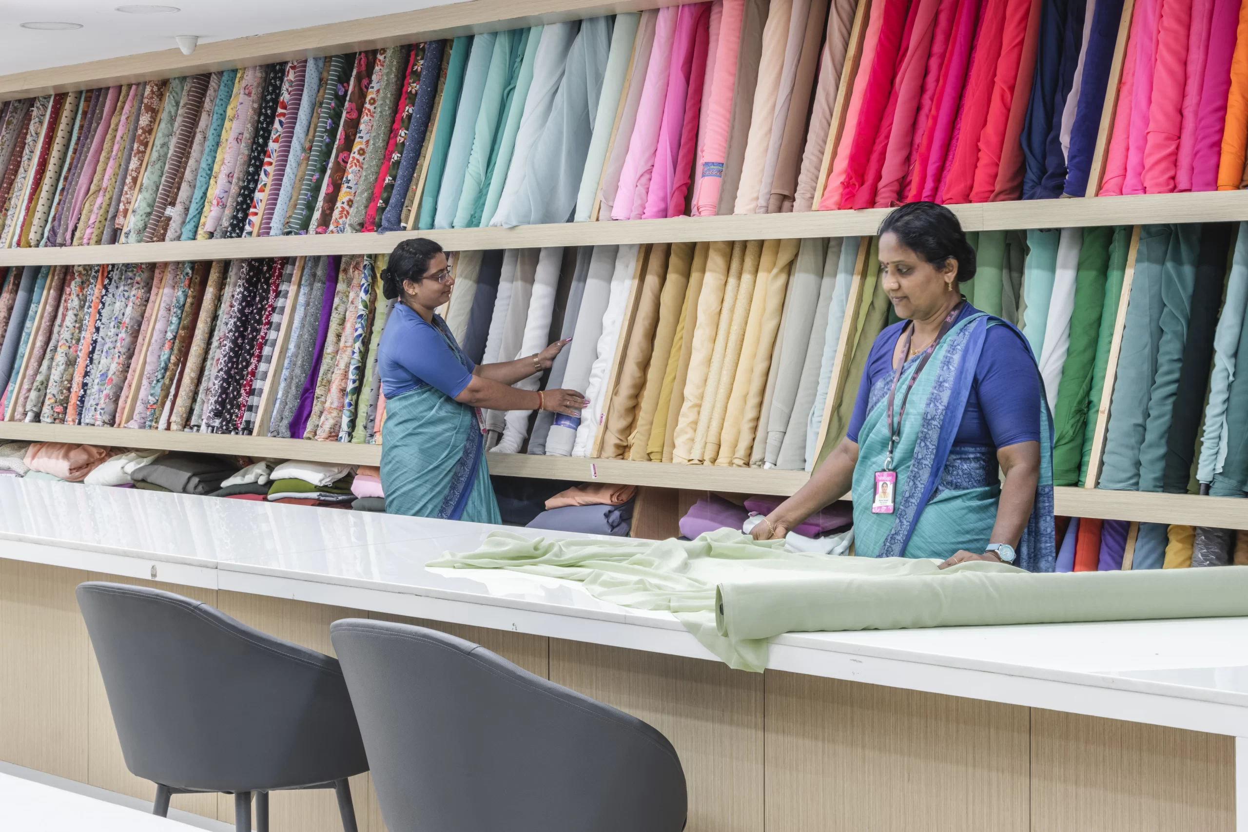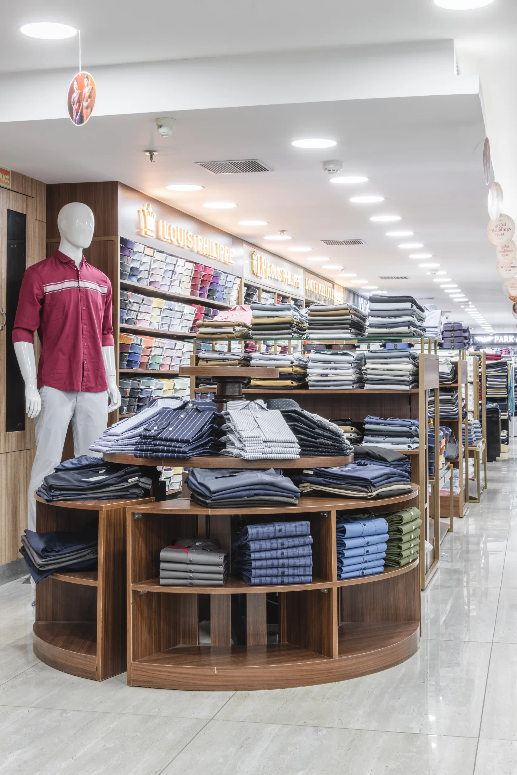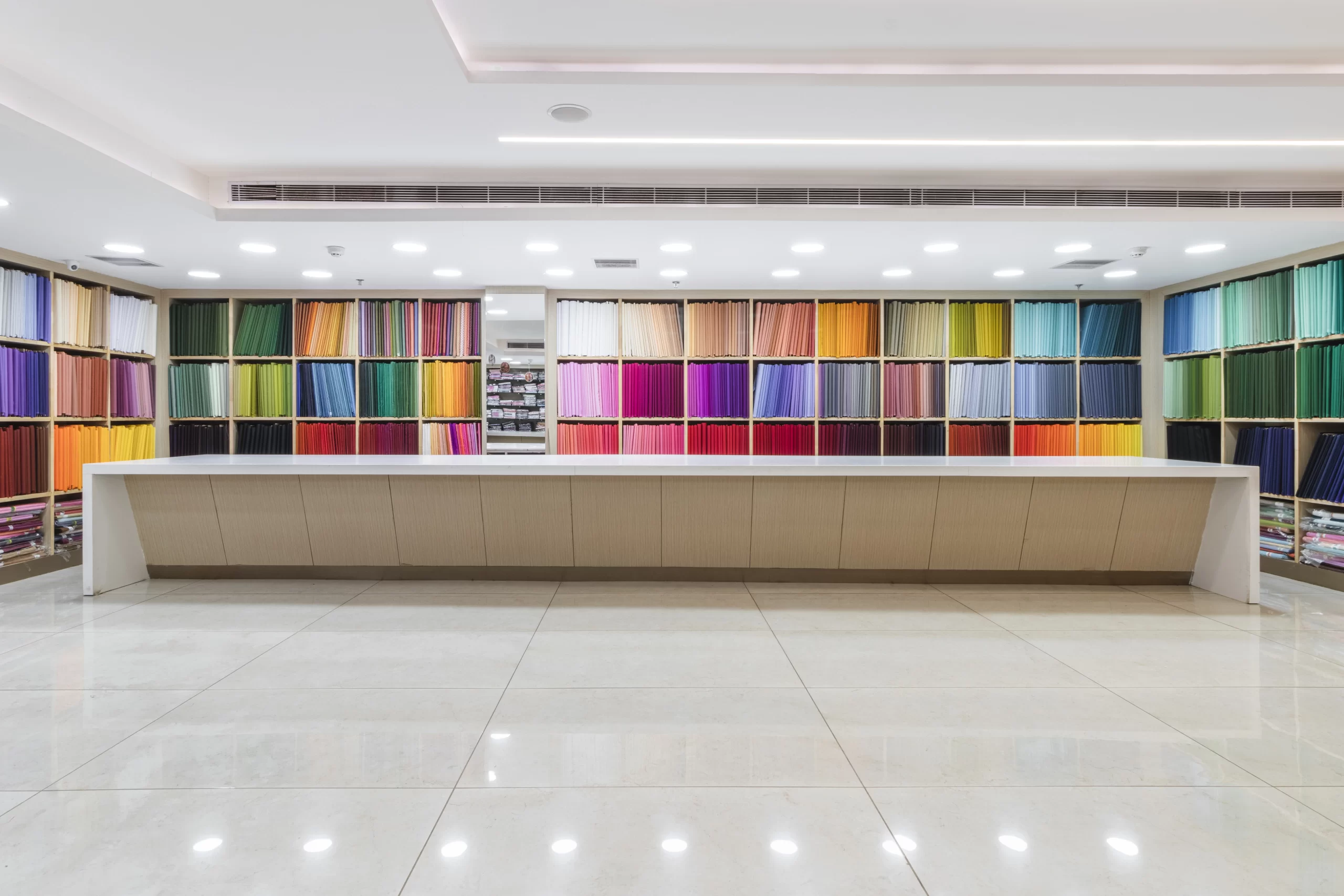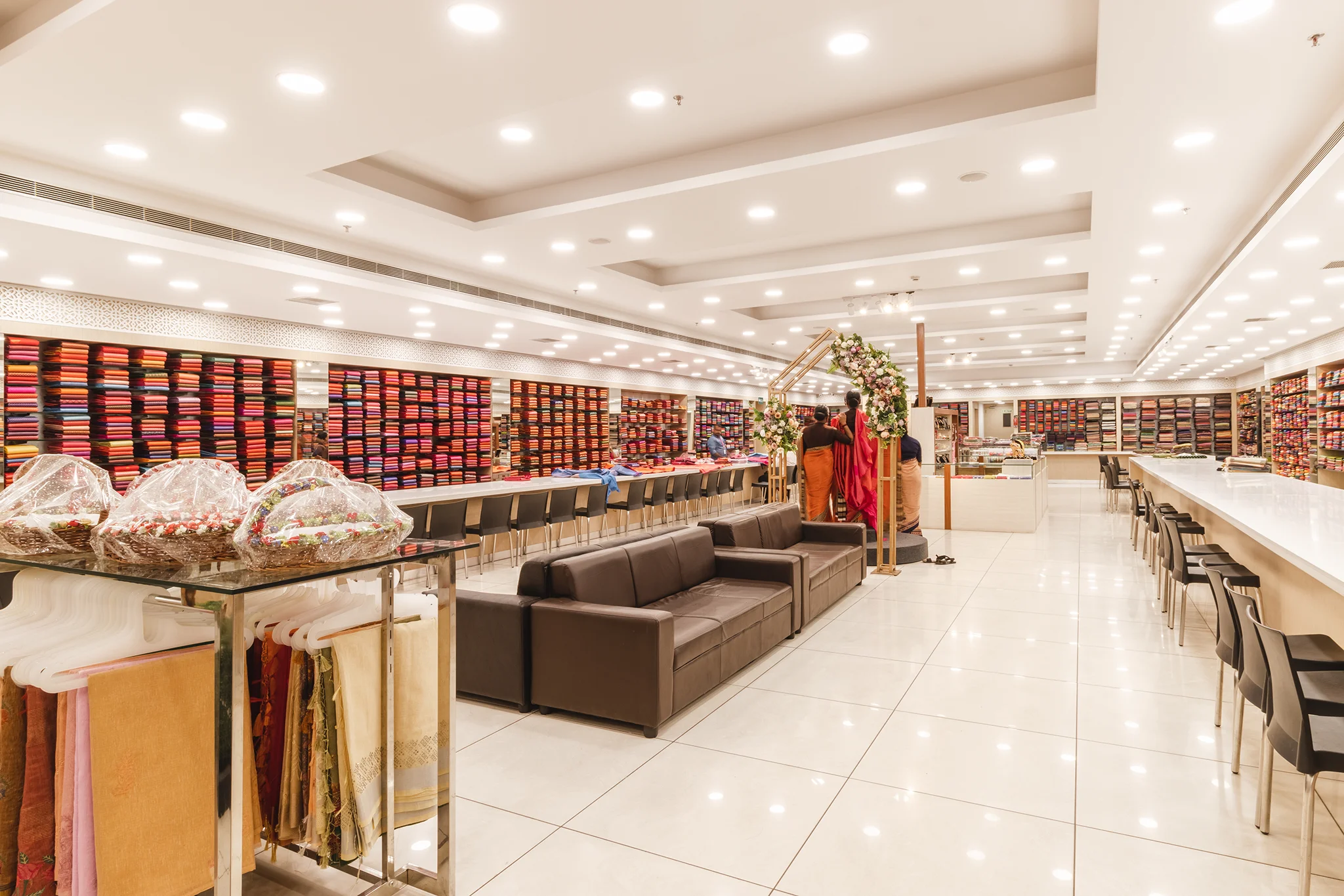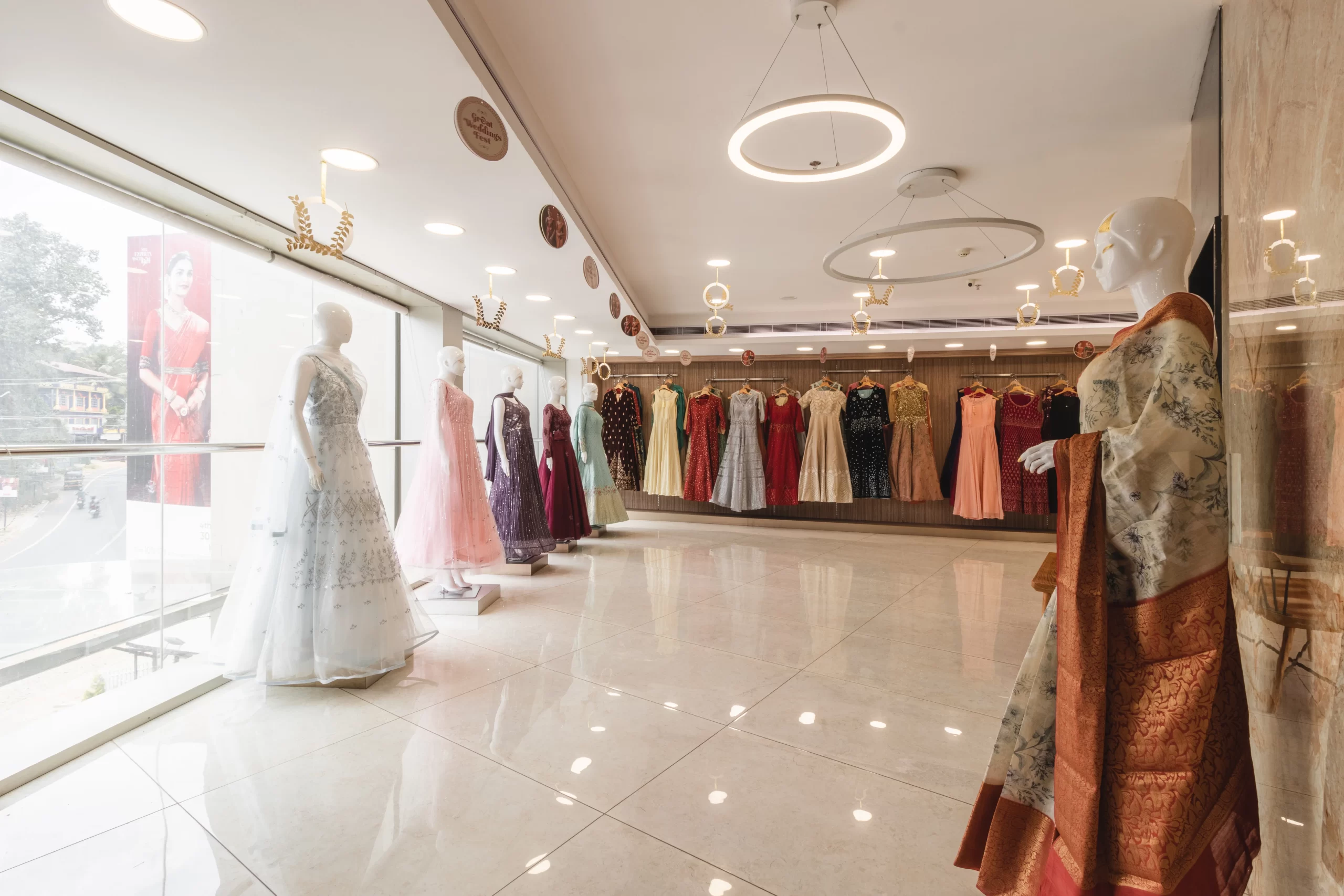 The showrooms were thoughtfully divided into different sections, each housing a diverse range of exclusive products. From fabrics and finished goods to casual saris, a dedicated bridal floor, ladies’ western wear, a kid’s section, and even a play area, every aspect was carefully considered. Each level of the showrooms seamlessly integrated various design elements, lighting, and spatial arrangement to create a harmonious symphony that beautifully presented Pulimoottil Silks’ exquisite collection.